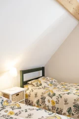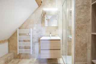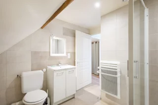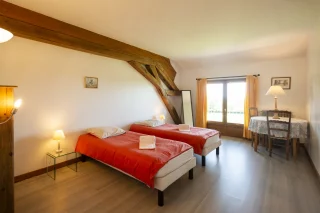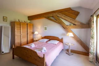 Chambres lovées sous les toits, très cocoon. Agréable jardin engazonné de 150m². Belle vue dégagée sur la campagne environnante. Accès à la piscine avec jardin (clos de murs) et tennis privé.